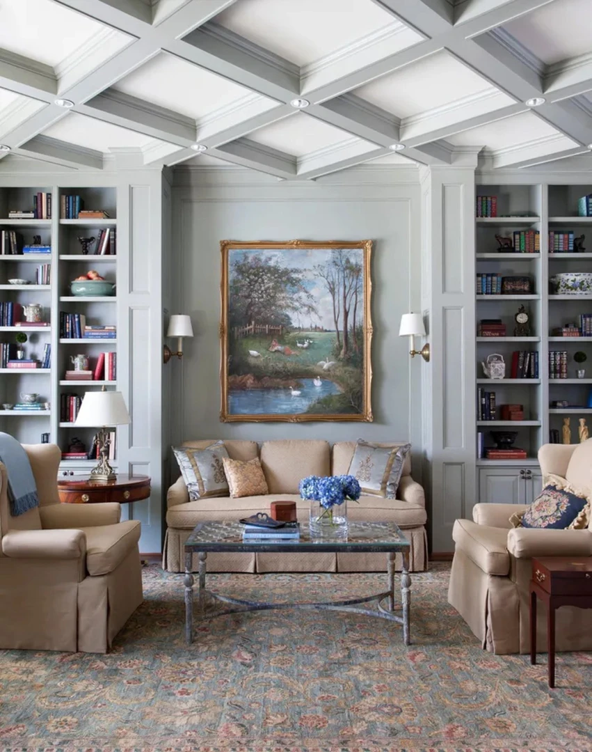 Đặt đèn trần ở giữa phòng và sử dụng nó để định hướng bố cục không gian, với bàn cà phê được đặt ngay bên dưới và chỗ ngồi được bố trí xung quanh tiêu điểm trung tâm.