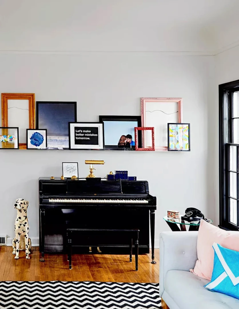 Một chiếc kệ treo là ý tưởng treo tranh giúp tăng thêm nét cá tính cho bức tường trống và cho phép bạn dễ dàng thay đổi tác phẩm nghệ thuật của mình.