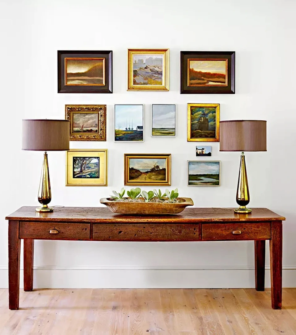 Tìm kiếm những hình ảnh có kích thước tương tự và sắp xếp các khung theo kiểu lưới trên tường, để tạo thành một bố cục gắn kết.