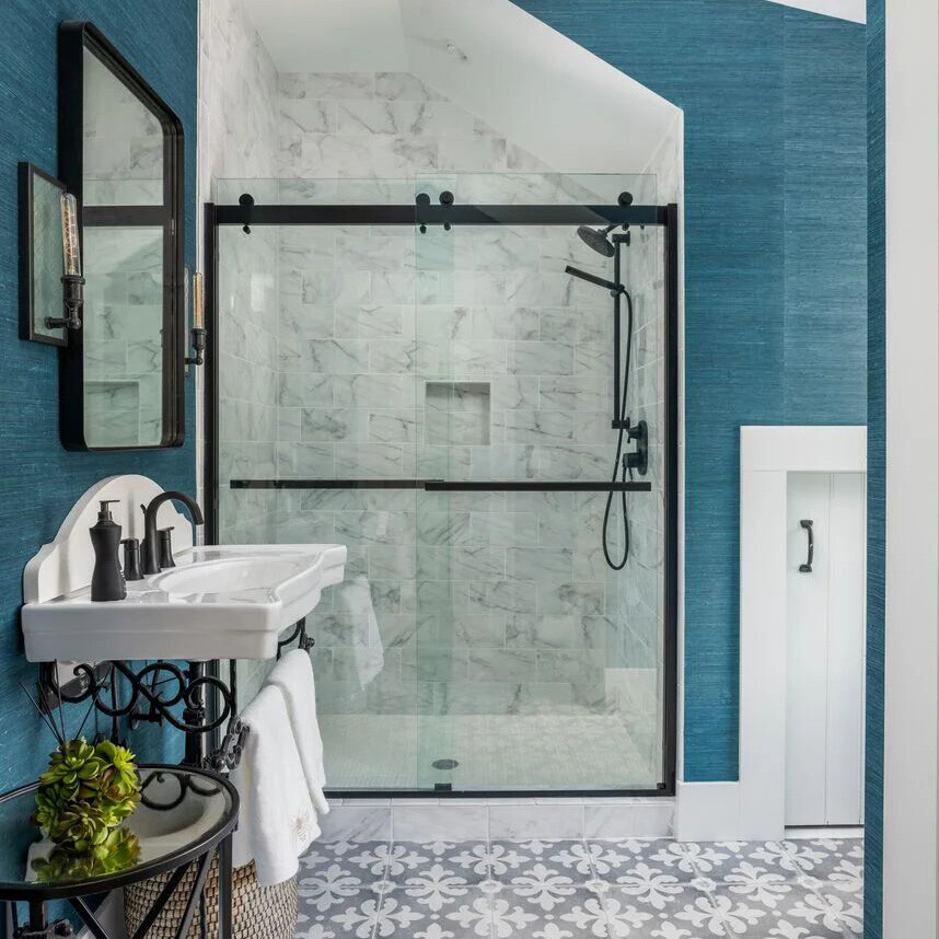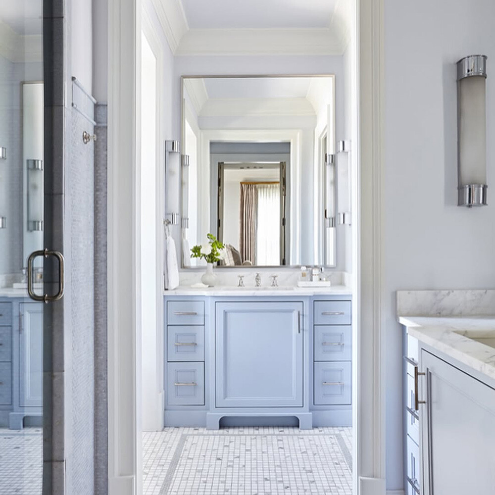 Các gam màu xanh dương như xanh navy thường được ưa chuộng trong thiết kế phòng tắm nhờ khả năng gợi liên tưởng đến biển cả và bầu trời, mang lại cảm giác thư giãn và dễ chịu. Bạn có thể ứng dụng sắc xanh này qua một mảng tường sơn hoặc ốp gạch xanh đậm, hay rèm cửa cùng tông nhằm tạo hiệu ứng thị giác về một không gian rộng rãi hơn. Ngoài ra, hãy thử kết hợp các vật dụng màu trắng và chi tiết ánh bạc để tạo sự tương phản thú vị nhưng vẫn giữ được vẻ sang trọng và tinh tế.
