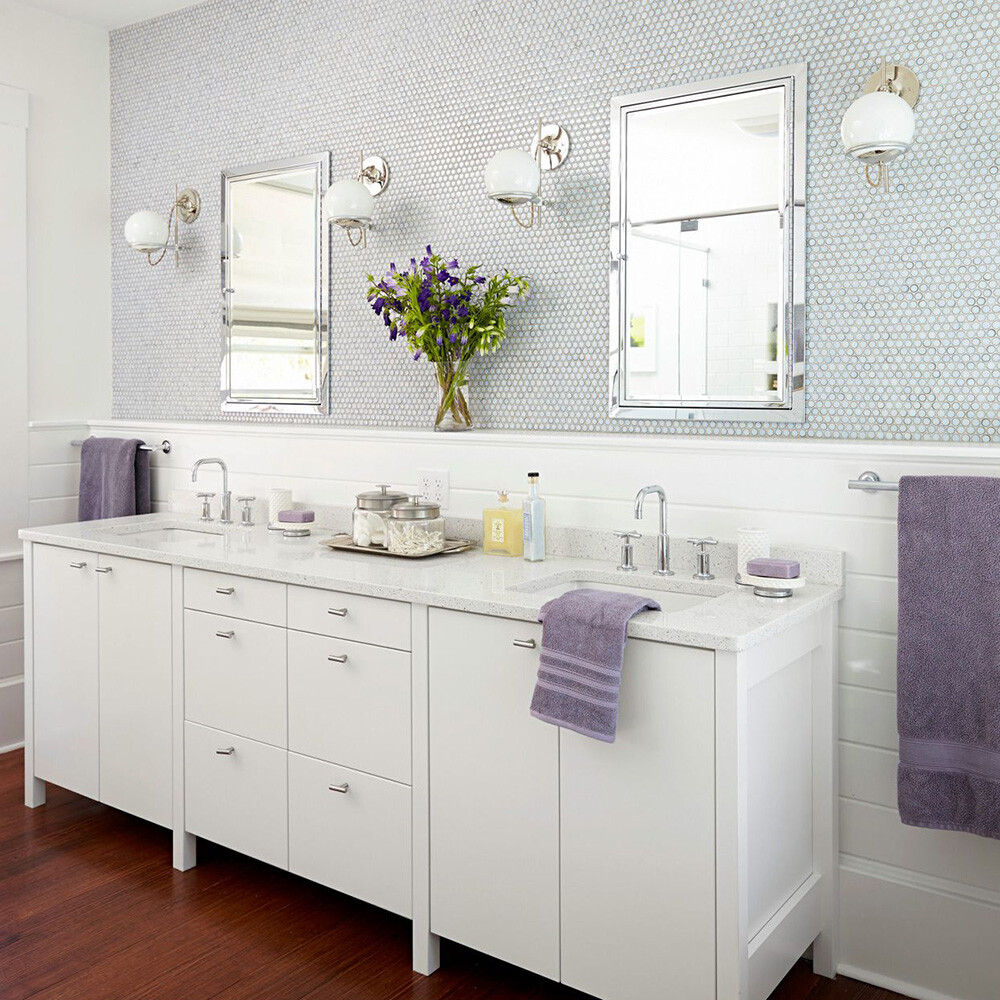 Nếu bạn yêu thích bảng màu pastel nhưng không muốn không gian phòng tắm trở nên quá nhẹ nhàng và ngọt ngào, hãy cân nhắc bản phối tím dừa cạn, trắng và bạc. Với bản phối này, bạn nên sử dụng màu trắng chủ đạo cho tường, các thiết bị vệ sinh và vật dụng chính trong nhà tắm. Đồng thời, đừng quên tạo điểm nhấn tinh tế với một vài chi tiết trang trí mang sắc tím dừa cạn. Bạn cũng có thể bổ sung những chi tiết có ánh bạc để tăng vẻ thanh lịch và hoàn thiện tổng thể căn phòng.
