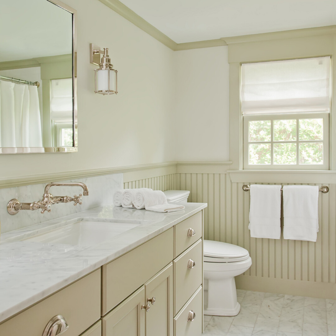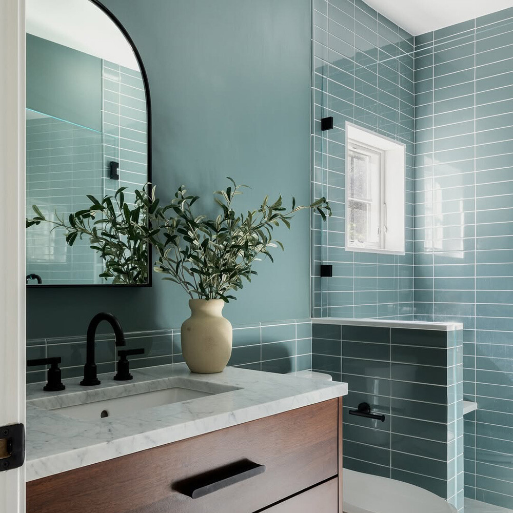 Seafoam là một sắc xanh lá dịu nhẹ, mang lại cảm giác thư thái mà không hề gây choáng ngợp – rất thích hợp để sơn hoặc ốp tường nhằm tạo điểm nhấn. Khi kết hợp cùng màu trắng của trần, sàn và các vật dụng nhà tắm quen thuộc, gam màu này sẽ giúp không gian trở nên sáng sủa, thoáng đãng và có chiều sâu hơn. Nếu muốn tăng thêm nét sang trọng nhưng vẫn giữ được sự hài hòa về tổng thể, bạn hãy thử bổ sung những chi tiết kim loại ánh bạc như gương, đèn tường, móc treo…