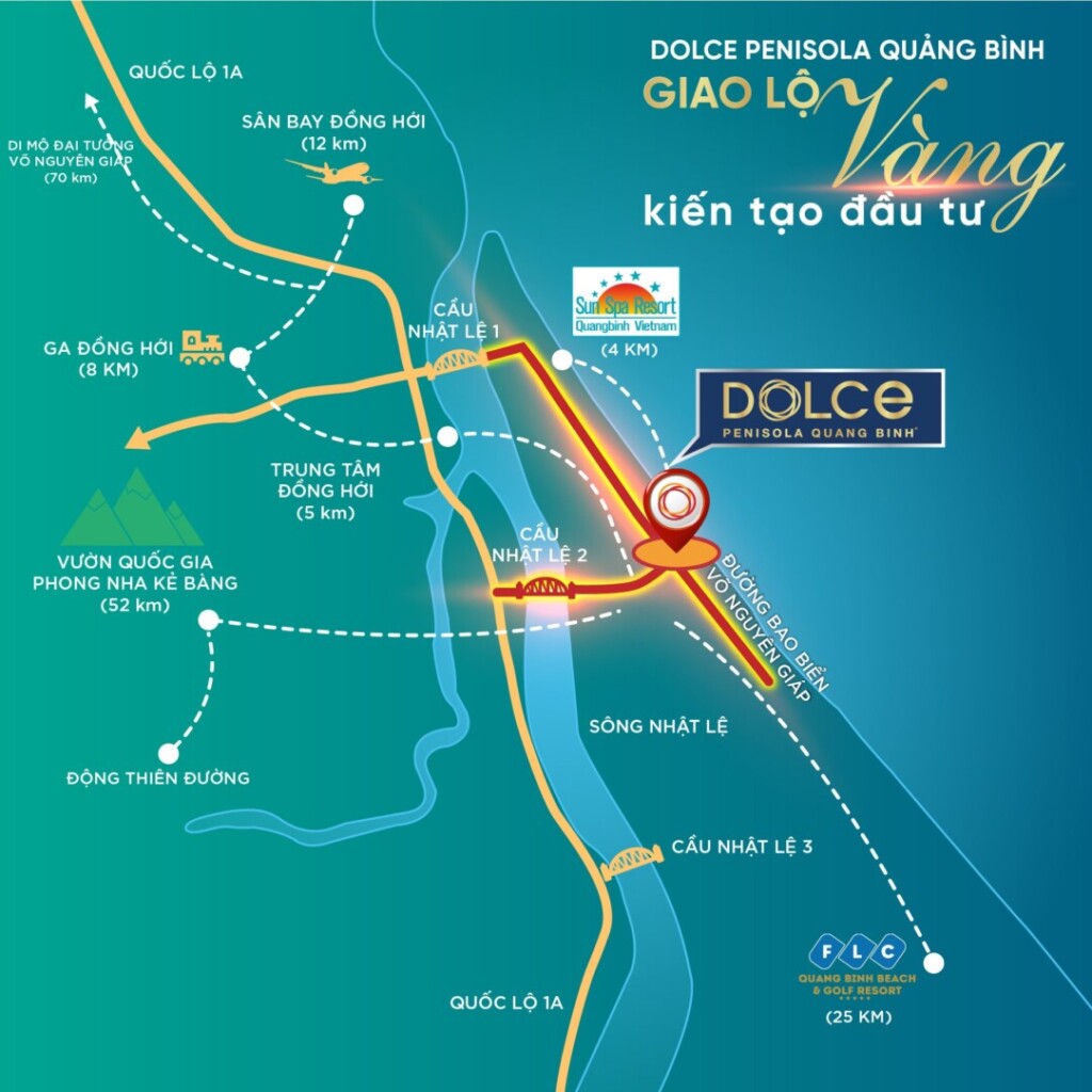 Dolce Penisola Quảng Bình sở hữu vị trí kim cương tại trung tâm Tp. Đồng Hới, gần kề bãi biển Nhật Lệ – Bảo Ninh thơ mộng.