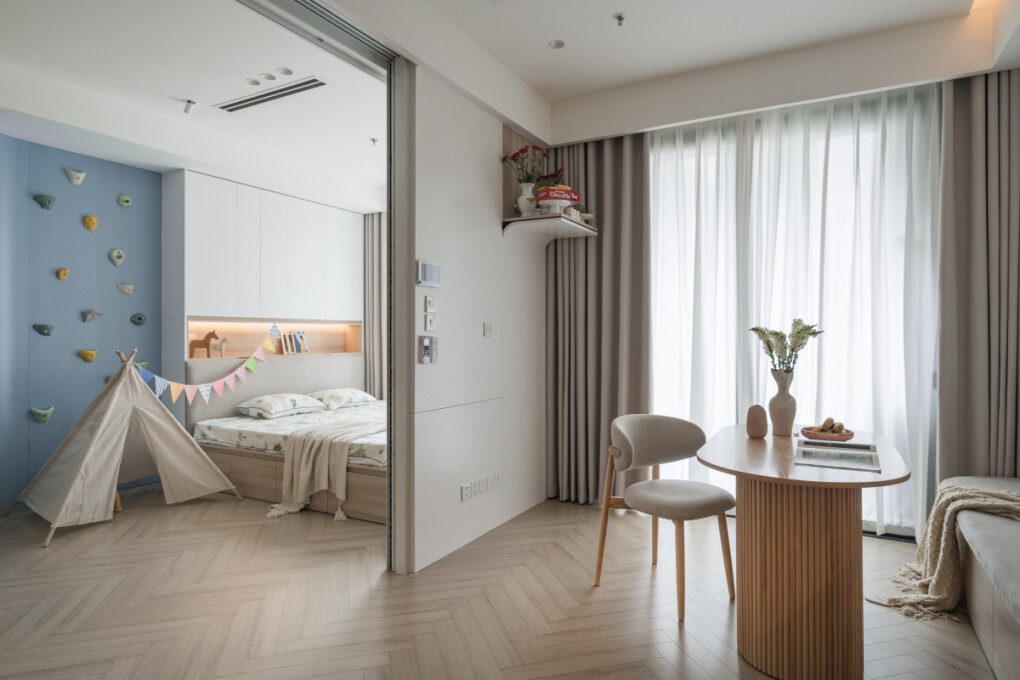 Hiện trạng ban đầu của căn hộ chỉ có một phòng ngủ. Để có không gian nghỉ ngơi riêng tư cho hai con, gia chủ chọn phương án ngăn phòng, cắt bớt diện tích khu sinh hoạt chung. Thay vì làm tường bao kín, phần vách được thiết kế dạng nan gỗ, nhằm tăng cảm giác thông thoáng cũng như khả năng kết nối giữa bố mẹ và con cái.
