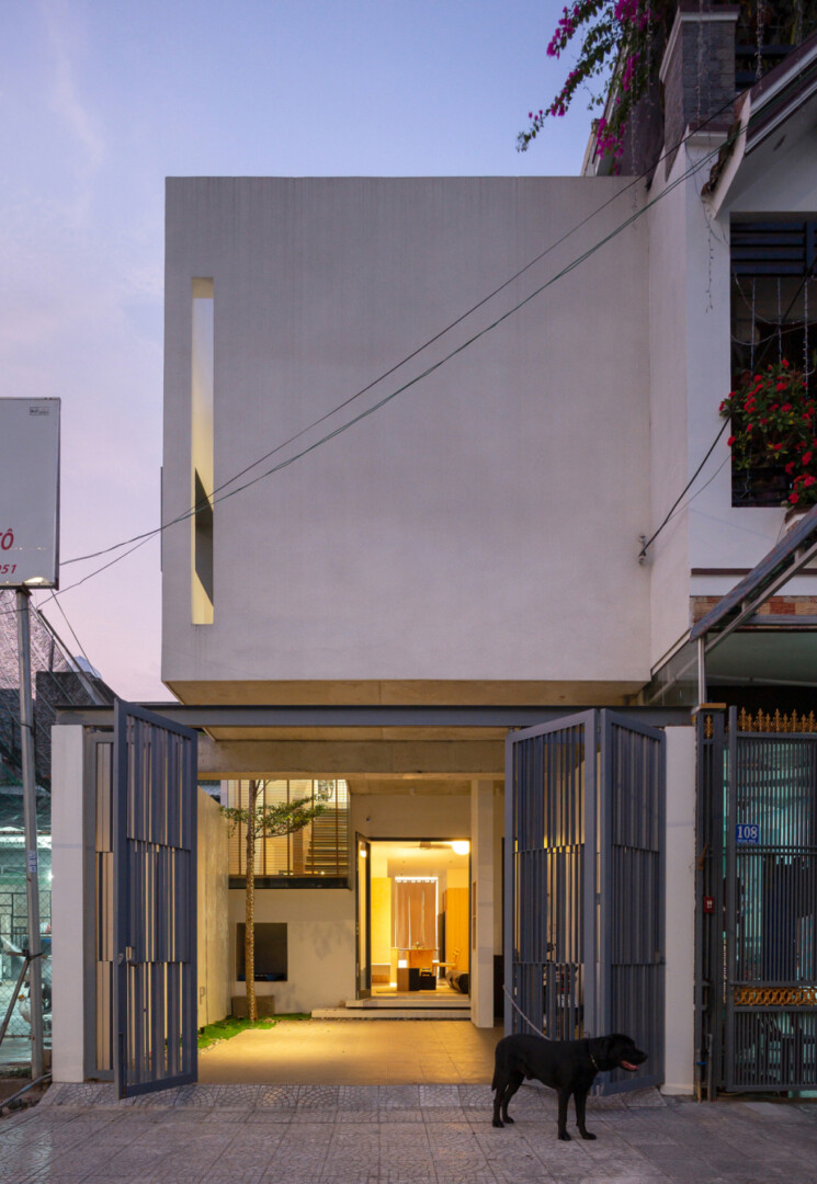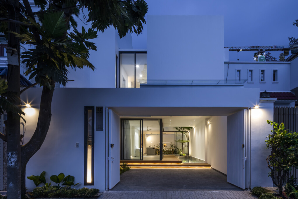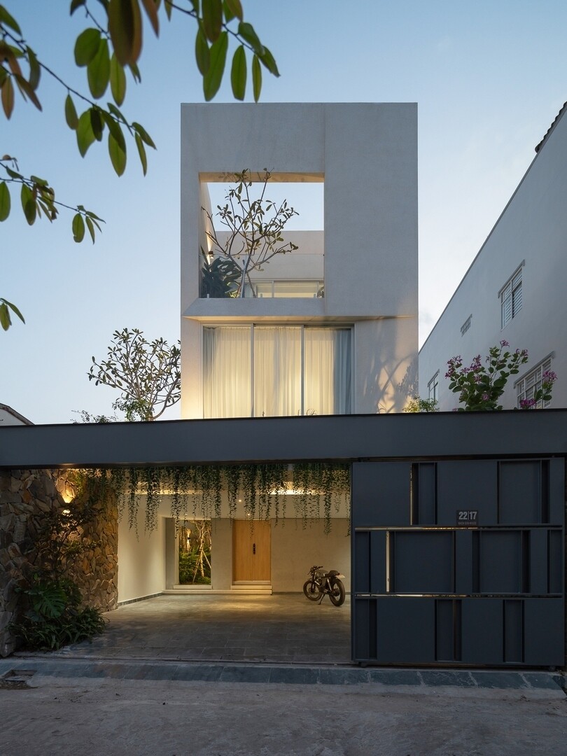 Nhờ kết hợp các giải pháp linh hoạt, ngôi nhà mang đến không gian sống thoáng đãng, thích nghi tốt với môi trường khí hậu hai mùa rõ rệt của TP HCM. Công trình sử dụng vật liệu cơ bản. Mặt tiền phủ sơn nước trắng, kết hợp các mảng kính lớn kéo dài. Việc chọn màu đơn sắc giúp công trình trở nên nổi bật khi trời sẩm tối và hài hòa với bối cảnh lúc trời rạng sáng.
